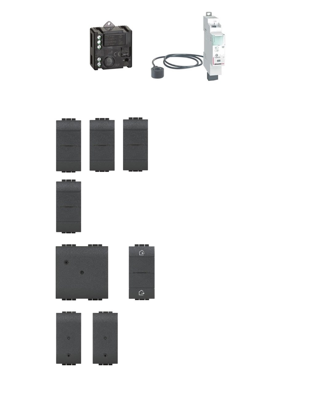 Starter Kit per gestire luci, prese e monitorare l\\'energia per evitare il black-out al raggiungimento della potenza massima prevista dal contratto dell’utente composto da: N°1 gateway art. L4510C (con nuovo comando entra/esci radio da incasso un modulo), N°3 deviatori connessi art. L4003C, N°1 relè luci connesso art. 3584C, N°1 dimmer connesso art. L4411C, N°2 moduli per presa connessa art. L4531C, N°1 modulo gestione carichi DIN connesso art. FC80GCS. Dispositivi con cover di colore grigio antracite.