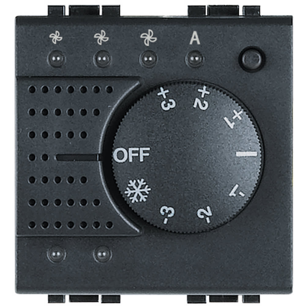 Sonda Livinglight per il controllo della temperatura ambiente per impianti di riscaldamento e raffrescamento. Dotato di manopola per la variazione di ± 3°C rispetto alla temperatura impostata nella centrale e per la selezione delle modalità OFF e antigelo con selezione della velocità manuale/automatica per fan-coil e sistema Idrorelax - 2 moduli.