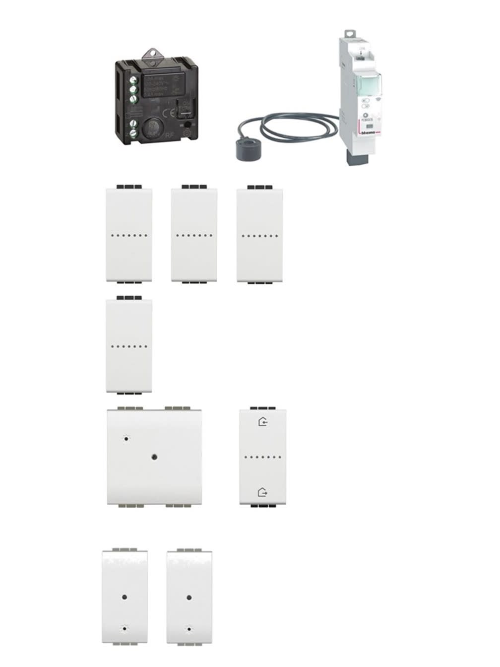 Starter Kit per gestire luci, prese e monitorare l\\'energia per evitare il black-out al raggiungimento della potenza massima prevista dal contratto dell’utente composto da: N°1 gateway art. N4510C (con nuovo comando entra/esci radio da incasso un modulo), N°3 deviatori connessi art. N4003C, N°1 relè luci connesso art. 3584C, N°1 dimmer connesso art. N4411C, N°2 moduli per presa connessa art. N4531C, N°1 modulo gestione carichi DIN connesso art. FC80GCS. Dispositivi con cover di colore bianco Light.