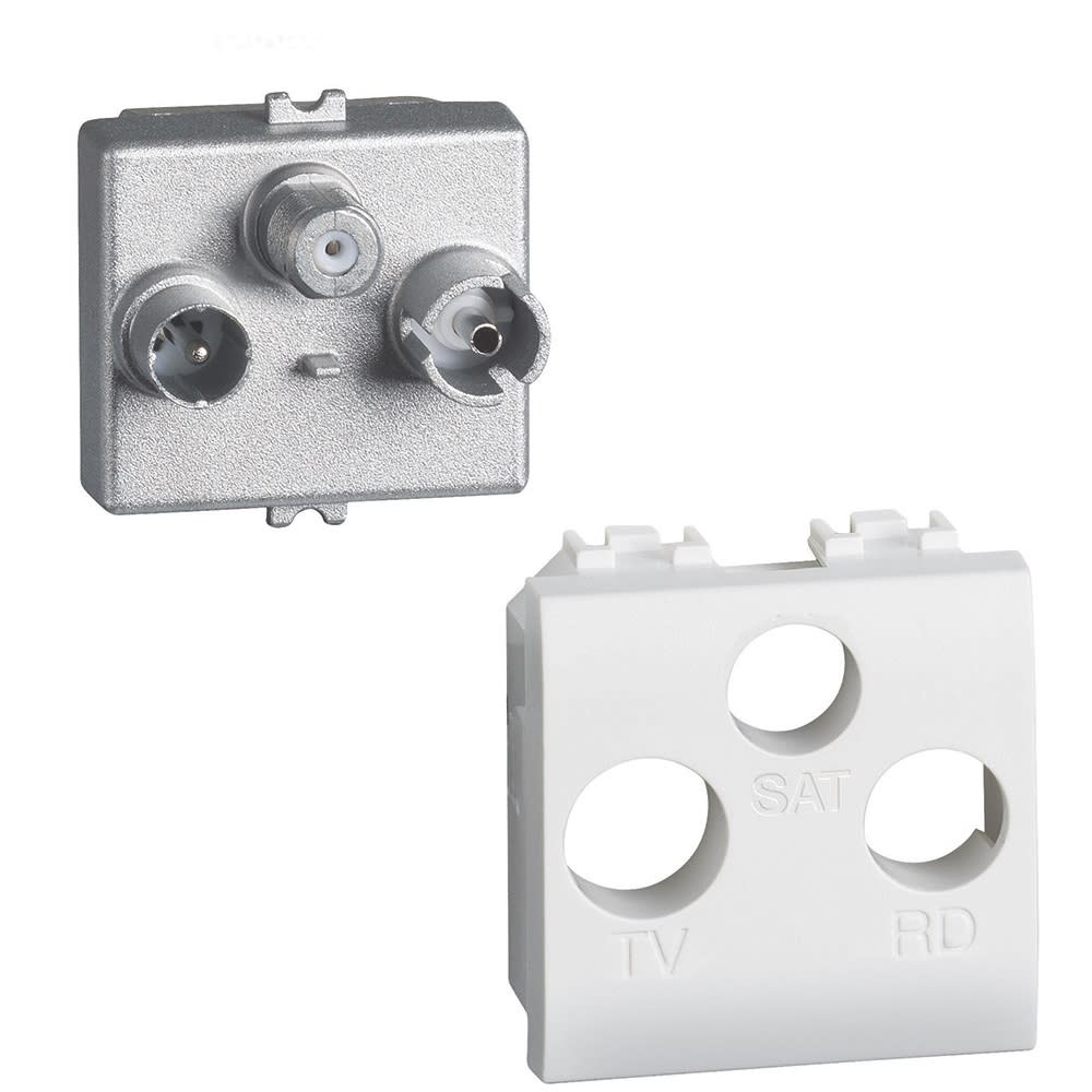 Presa coassiale diretta demiscelata per impianti di antenna TV monoutenza anche telealimentati e centralizzati in derivazione, impianti via satellite monoutente e centralizzati in derivazione con passaggio di corrente e di segnale per la selezione dei canali, ed impianti radio - connettore TV maschio Ø 9,5 mm - connettore SAT tipo F e radio femmina Ø 9,5 mm - colore bianco - 2 moduli