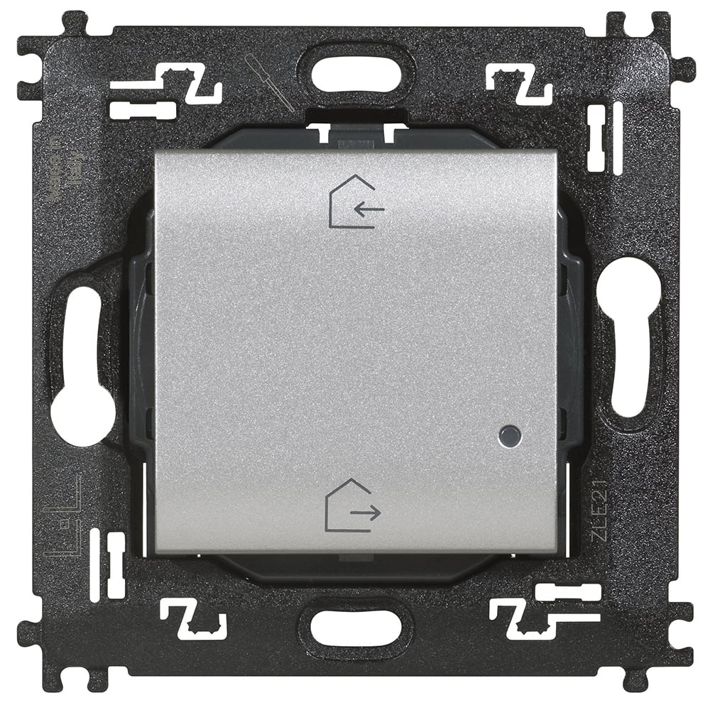 Comando scenario Entra&Esci wireless. Dispositivo dotato di 2 pulsanti per l’attivazione degli scenari Entra ed Esci personalizzabili dall’app HOME + CONTROL (lo scenario Esci è pre-impostato per chiudere tutte le tapparelle e spegnere tutte le luci). Installazione superficiale con adesivi riposizionabili (forniti a corredo) o su scatole da incasso. LED integrato per la segnalazione di batteria scarica. Alimentazione a batteria 3V tipo CR2032 (fornita a corredo) con autonomia di 8 anni - 2 moduli.