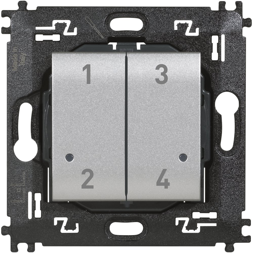 Comando 4 scenari wireless dotato di pulsanti contrassegnati 1,2,3 e 4 per l’attivazione di 4 scenari attivabili e personalizzabili dall’app Home + Control. Installazione superficiale con adesivi riposizionabili (forniti a corredo) o su scatole da incassoLED integrato per la segnalazione batteria scarica. Alimentazione a batteria 3V tipo CR2032 (fornita a corredo) con autonomia di 8 anni - 2 moduli.