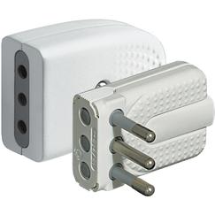 Coppia spina/presa Corner. Spina 2P+T 10A salvaspazio con spinotti orientabili e serracavo autobloccante. Presa 2P+T 10A di colore bianco - in blister 90x122 mm (LxA)
