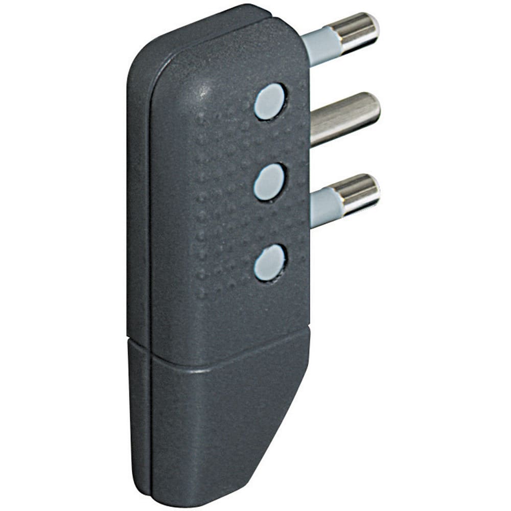 Spina corner a squadra 2P+T 16A salvaspazio con spinotti orientabili in linea o a squadra di colore antracite. Venduta in blister 90x122 mm (LxA)