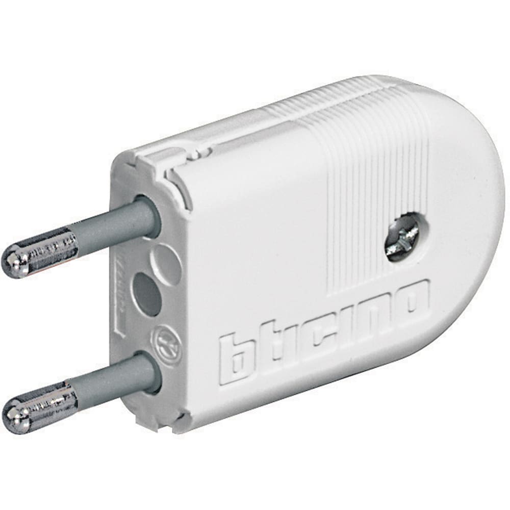 Spina volante 2P 10A di colore bianco con uscita cavo regolabile su 3 posizioni e spinotti orientabili
