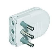Spina volante 2P+T 10A salvaspazio di colore bianco con uscita cavo regolabile su 3 posizioni e spinotti orientabili . Venduta in blister 90x122 mm (LxA)