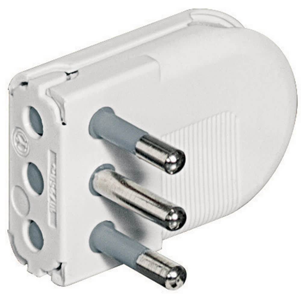 Spina volante 2P+T 10A salvaspazio di colore bianco con uscita cavo regolabile su 3 posizioni e spinotti orientabili