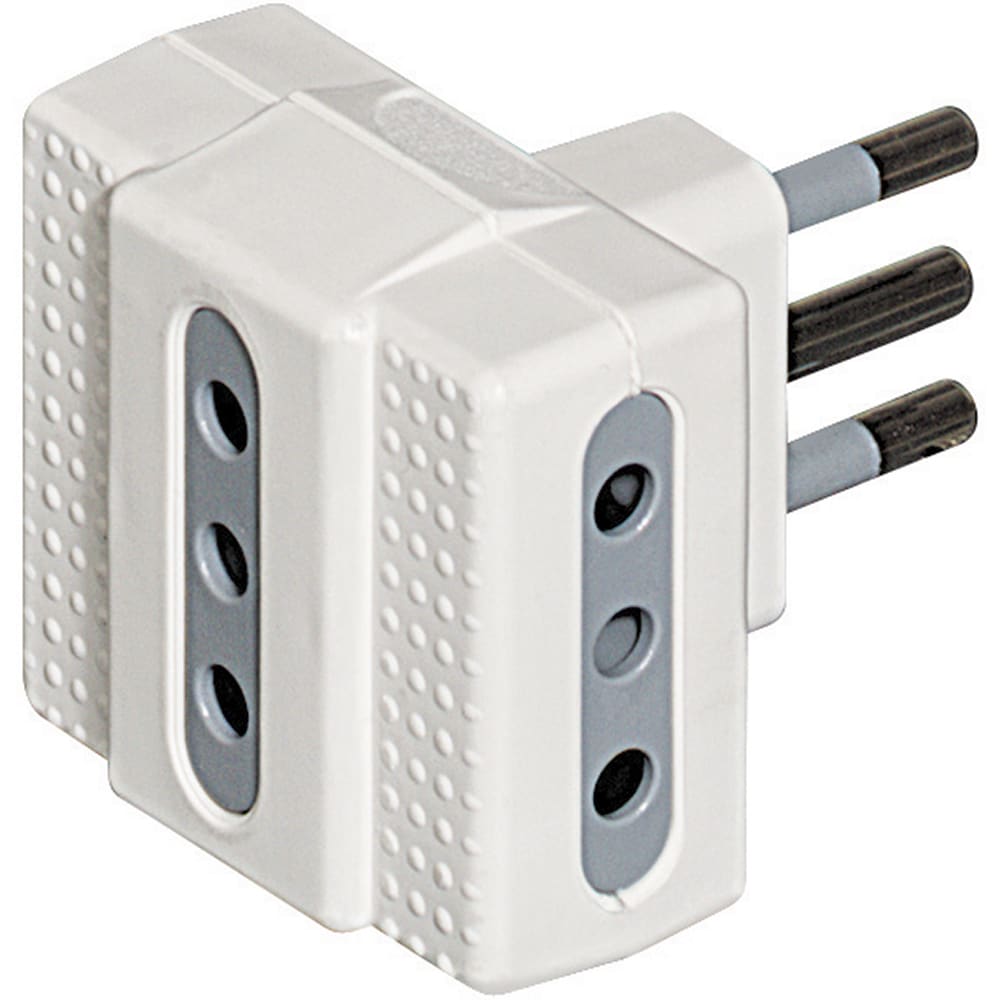 Adattatore TRIS con 3 prese 10A e spina 10A di colore bianco. Venduto in blister 90x122 mm (LxA)