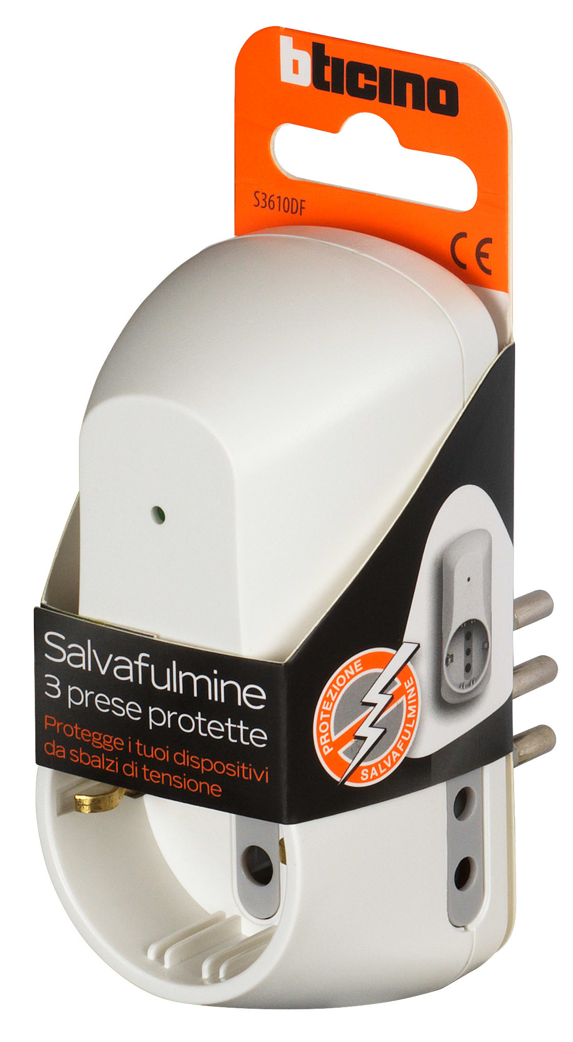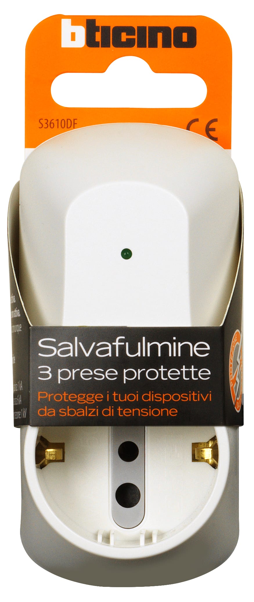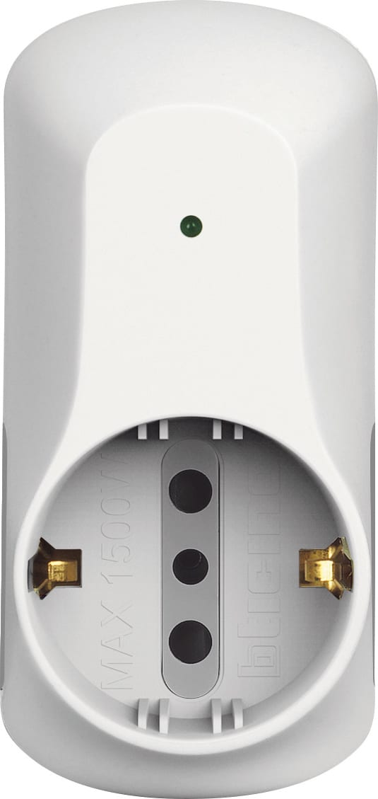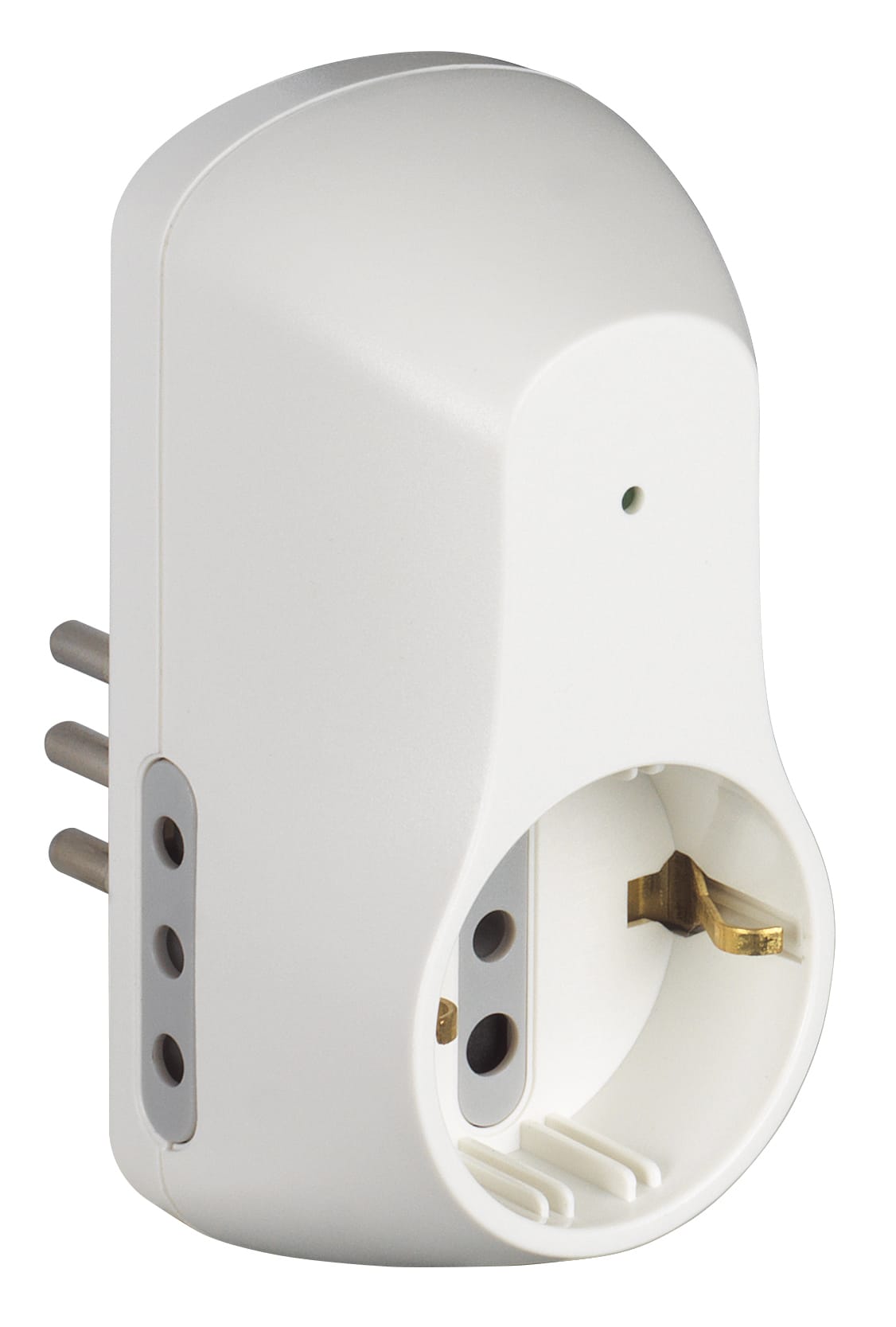 Adattatore con spina 10A, 2 prese 10A + 1 presa P30 250V (alveoli protetti), potenza massima prelevata 1500W, di colore bianco - con dispositivo salvafulmine