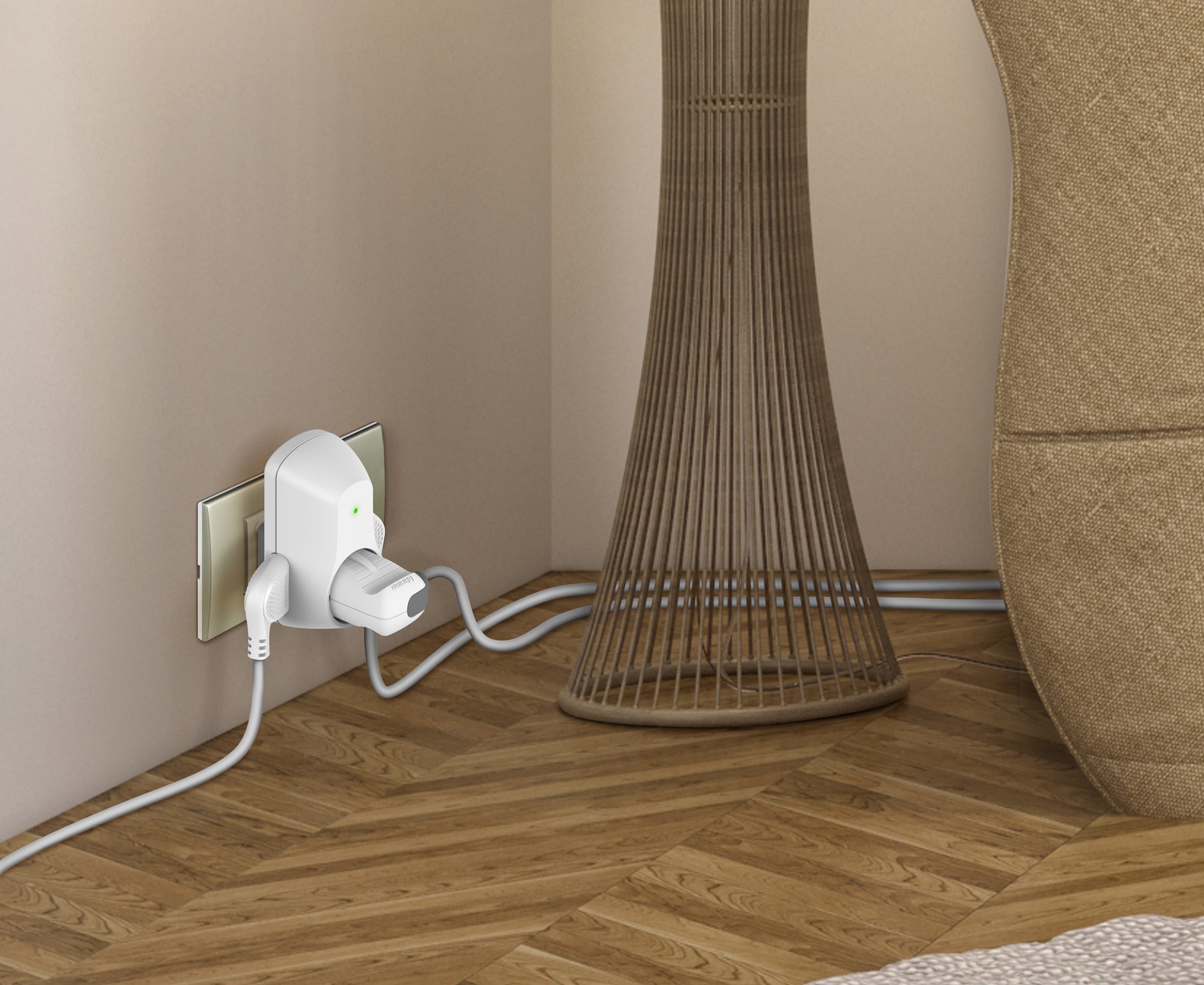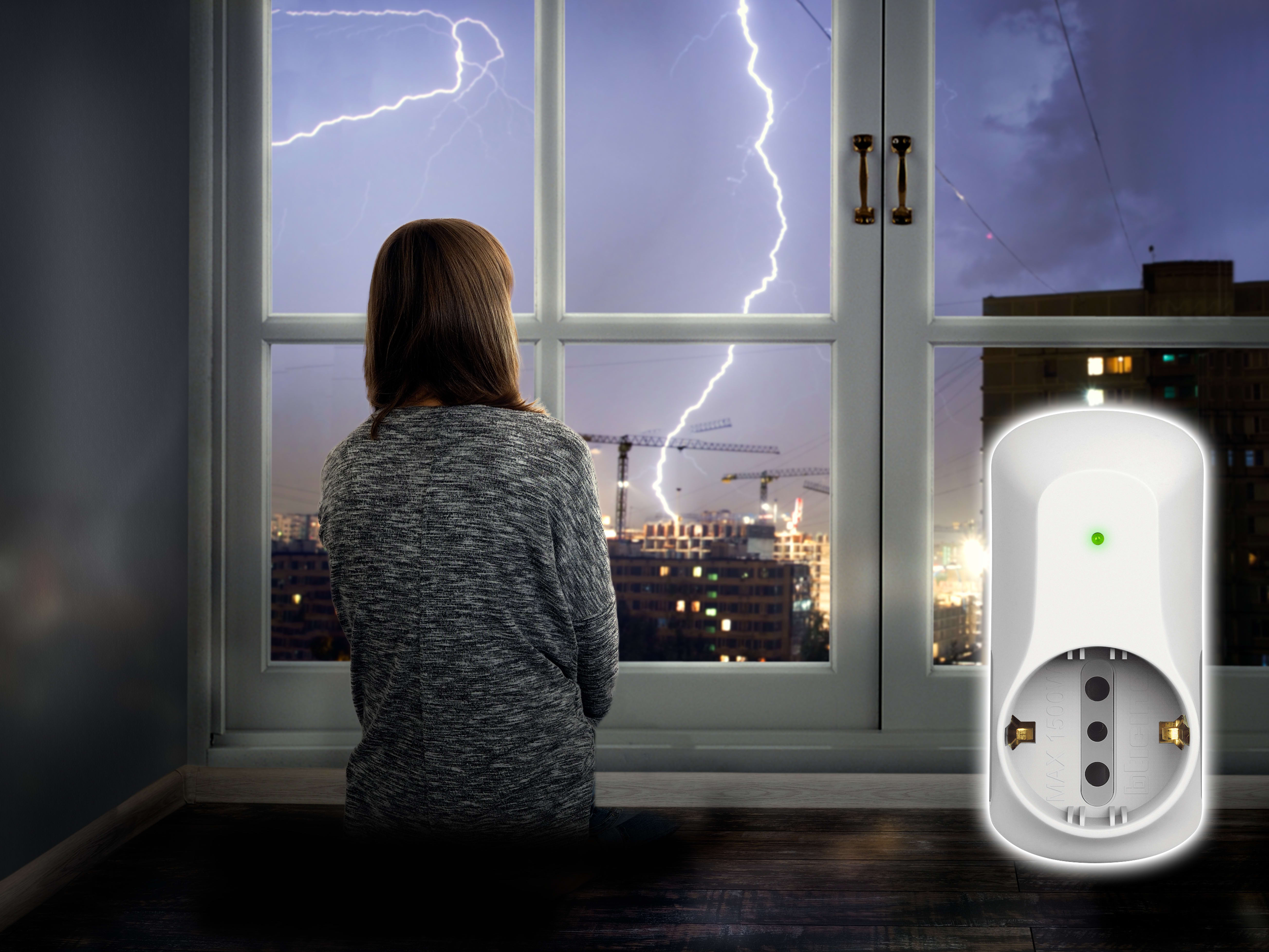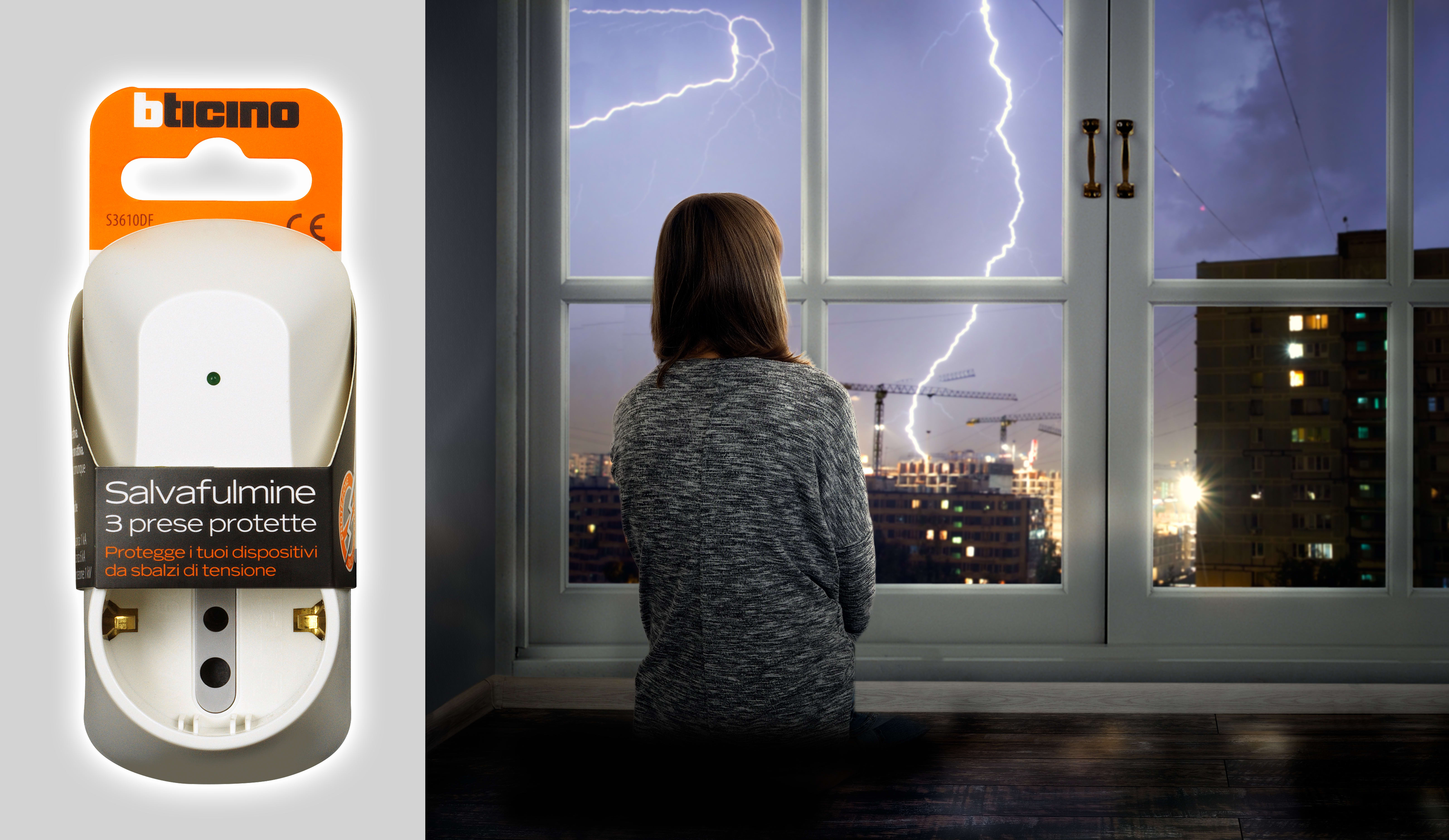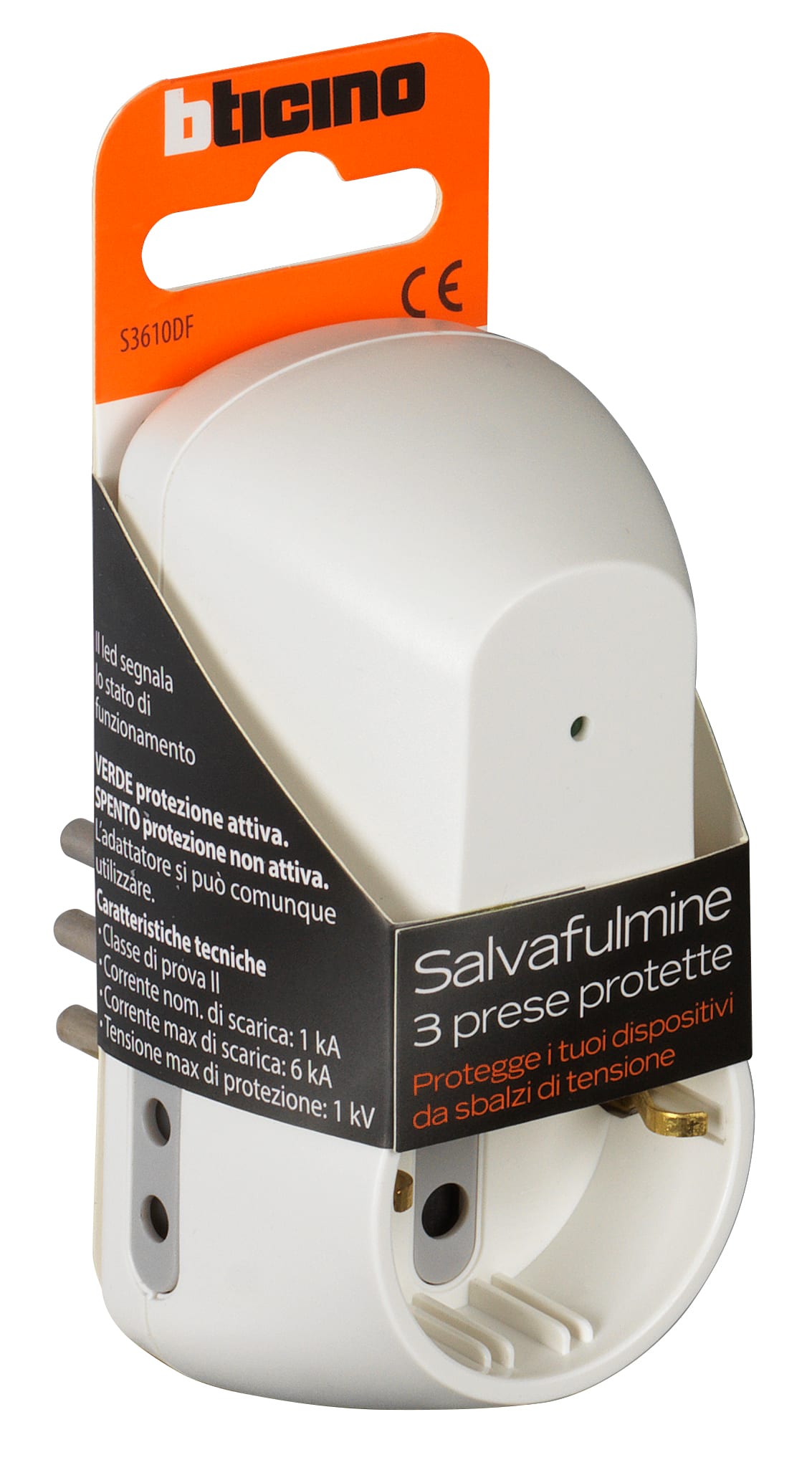 Adattatore con spina 10A, 2 prese 10A + 1 presa P30 250V (alveoli protetti), potenza massima prelevata 1500W, di colore bianco - con dispositivo salvafulmine