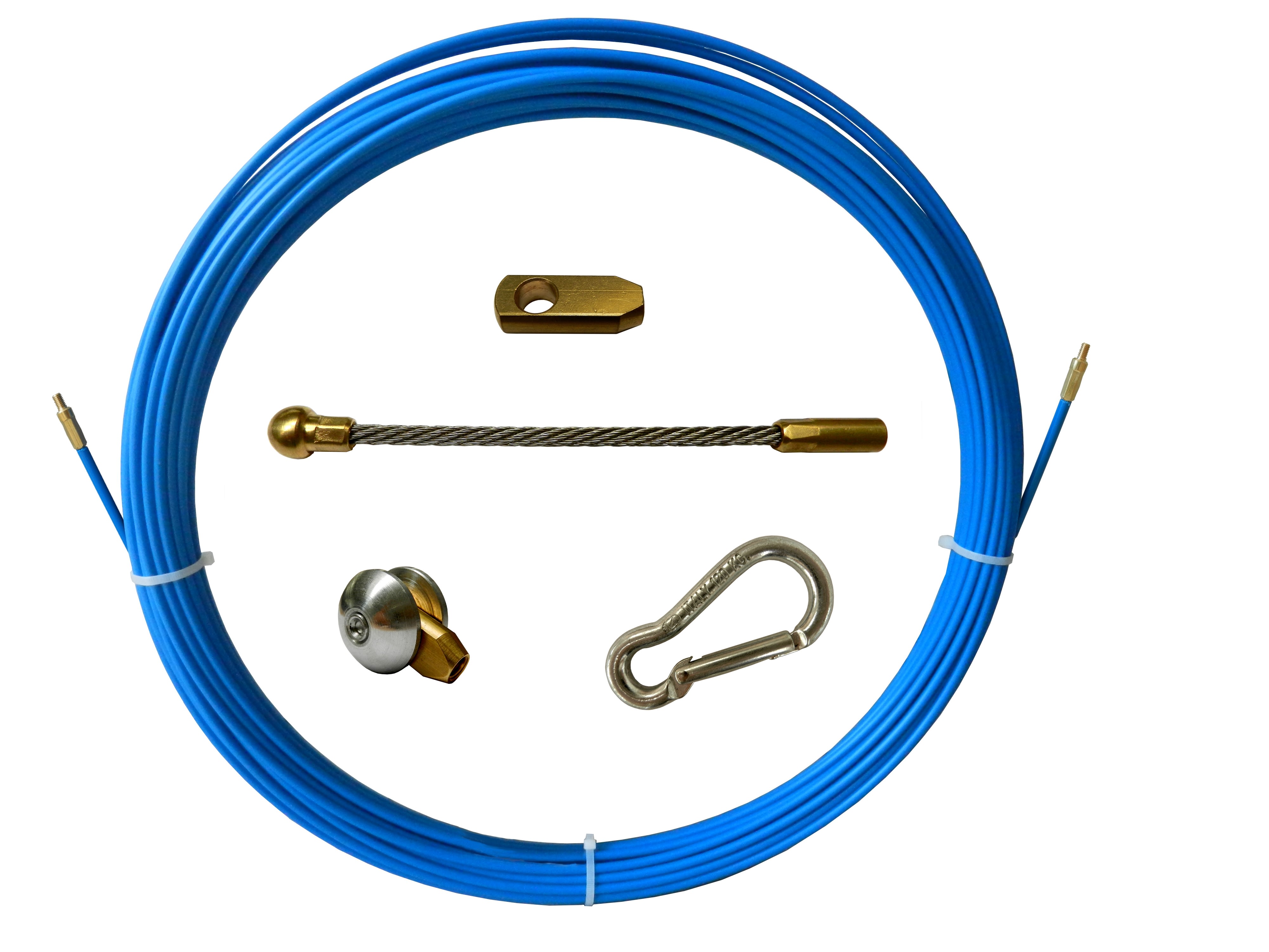 Sonda in piattina d’acciaio temprato blu 4x1,5 mm rivestita in polipropilene a Ø 6 mm da 60 m con terminali intercambiabili filettati M5. Dotata di: testa flessibile, carrucola di scorrimento, oliva di aggancio, moschettone. Non impiegare in condotte concavi in tensione