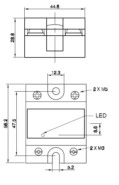 Relè a stato solido monofase, montaggio da retroquadro, indicazione a LED, protezione IP20, CA. Isolamento > 4000 Vrms. • Dimensioni (HxLxP): 58,2x44,8x28,8 mm • Varistore integrato.