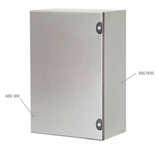 Cassetta composta da corpo, porta cieca esterna acciaio inos AISI 304, piastra interna fissata sul fondo e piastra passacavi• corpo in lamiera pressopiegata e saldata sp. 12-15/10, verniciatura con polveri epossipoliestere termoindurenti in tinta RAL7035bucciato • porta in acciaio inox 304 satinato scotch brite sp. 12-15/10 • piastra interna in lamiera sp. 15-20/10 sendzimir • guarnizioni, poliuretaniche applicate in colata continua • cerniere reversibili con apertura 110° • serratura con impronta doppia aletta • grado di protezione IP 66-UL NEMA TYPE 4 IK 10.