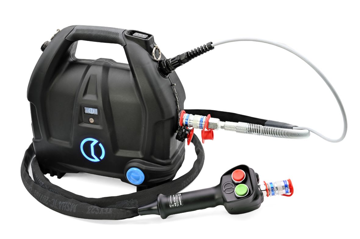 Pompa elettro-oleodinamica portatile, alimentata da batteria Li-Ion 36V per un impiego autonomo. CB3662L Batteria 36 V - 6,2 Ah Li-Ion ASC145-EU Caricabatteria Cavo USB Tracolla da agganciare agli appositi anelli previsti sulla pompa. CVB-037 Zaino per il trasporto della pompa e dei suoi accessori ERCH-WH Manopola di comando integrata con tubo flessibile per alta pressione, lungo 3 m.
