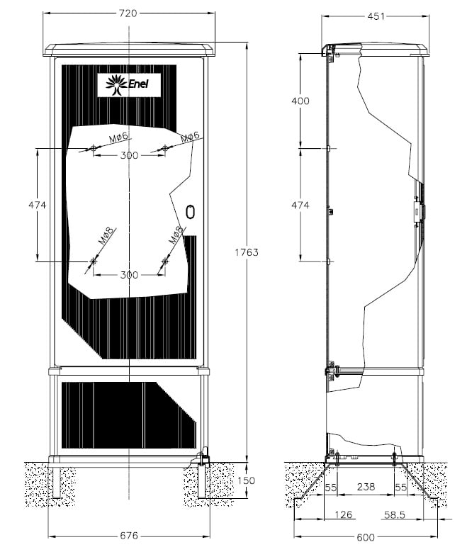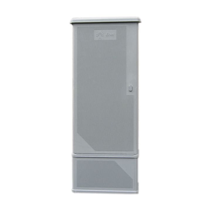 Armadio realizzato in SMC stampato a compressione, colore grigio RAL 7040. Sportello incernierato in 4 punti con cerniere realizzate in lega di alluminio UNI-EN 1706 AC-46100 DF. Serratura a doppia chiusura tipo unificato Enel secondo DS 4541. Parete di fondo predisposta per il fissaggio di gruppo di misura trifase integrato tipo GTWS per forniture BT superiori a 30 KW fino a 200 KW. Telaio di ancoraggio in lamiera di acciaio zincato a caldo secondo CEI 7-6. Armadio con caratteristiche meccaniche conformi a tabella ENEL DS 4558 - Dicembre 2001.