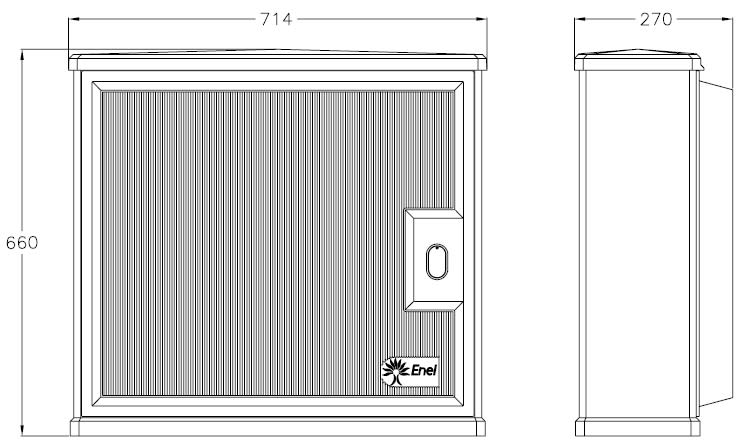 Armadio realizzato in vetroresina – colore grigio RAL 7040 Serratura a doppia chiusura tipo unificato Enel secondo DS 4541 Grado di protezione IP43 secondo CEI EN 60529, IK10 secondo CEI EN 62262. Adatto per il montaggio dei contatori elettronici: - Max n.1 trifase integrato tipo GTWD per potenze da 15 a 30 Kw - Max n.1 trifase per potenze da fino a 30 Kw tipo GET3A; fissaggio mediante base DS 4464/2 (matricola 280012) Da integrare con i relativi accessori per installazione a parete, a palo, a pavimento (telaio, piedistallo, basamento)