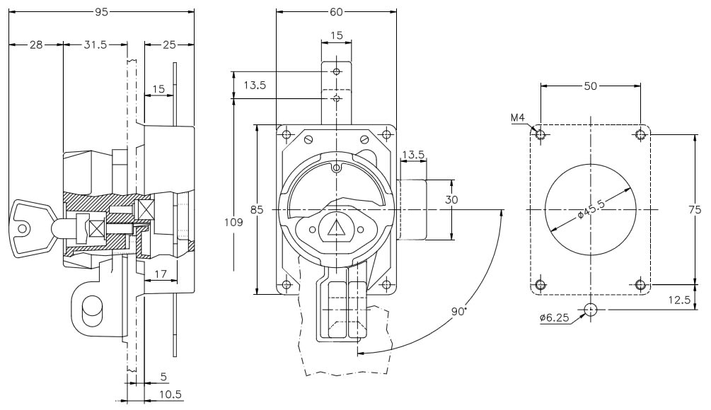 Serratura con doppio sistema di chiusura, azionabile con chiave ad impronta triangolare e predisposta per applicazione lucchetto. Corredata di chiave, stampata in resina poliammidica rinforzata con fibra di vetro, cilindro/rotore in ottone. Funzionamentotipo cremonese in 3 punti.