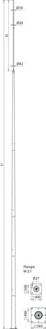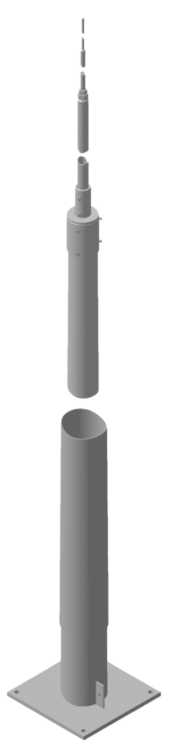 Palo componibile di captazione per fondamenta a bicchiere o in cemento, provato secondo CEI EN 62561-(1+2). Per la protezione da scariche dirette di impianti particolari, come p.es. impianti biogas, campi fotovoltaici a terra, impianti classificati Ex, depositi munizioni. Il palo è dimensionato conforme all'Eurocode per raffiche di vento max. 171 km/h. I pali vengono messi in opera sul posto, con la fondazione a bicchiere (elemento prefabbricato) o nelle fondamenta in cemento con la gabbia di ancoraggio.Esecuzione con piastra a flangia per un montaggio rapido e componenti conici del palo con sistema ad innesto, compresa statica provata. Altezza sopra terra 16,35 m.