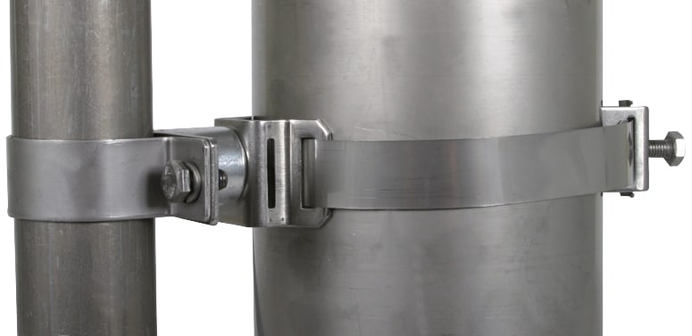 Fascetta di fissaggio con nastro tenditore, per il montaggio di tubi portanti DEHNiso-Combi, p.es. su pali d'antenna oppure altre tubazioni. Esecuzione con elemento distanziatore, lunghezza 30 mm, per poter compensare gli elementi di fissaggio di antennesu pali.