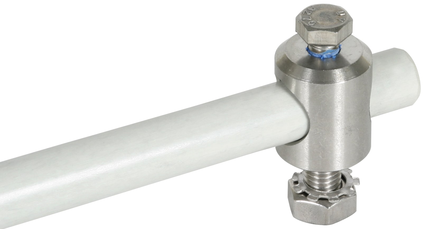 Perno di fissaggio con filetto M10, dado, rondella dentata e vite per l'inserimento del distanziatore (D16 mm). Esecuzione in INOX.