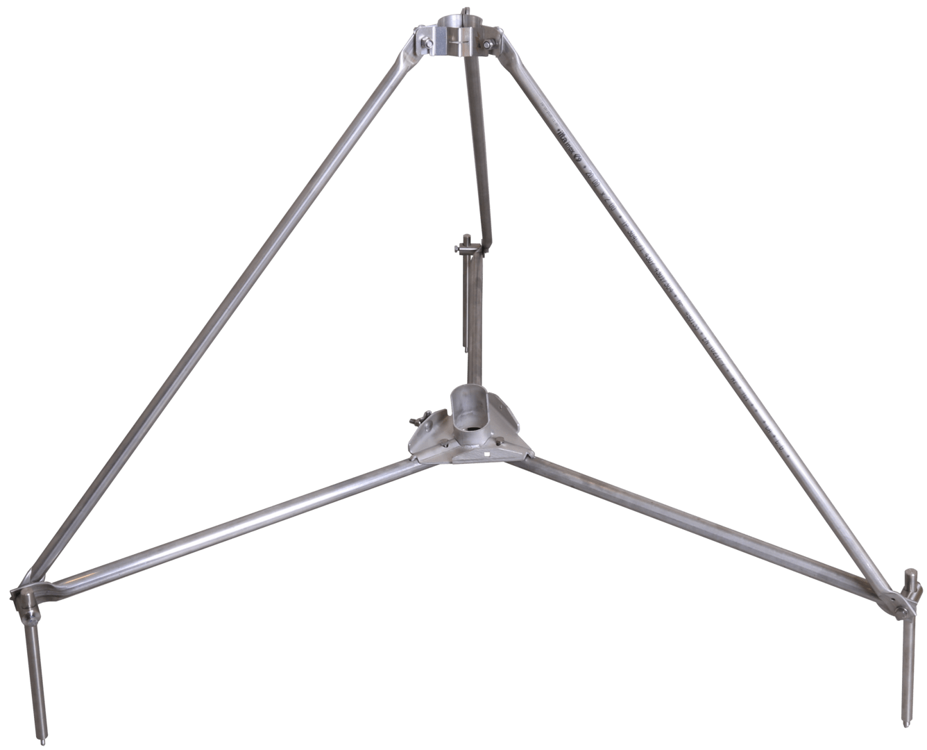 Tripode (versione pieghevole) per tubi portanti D 50 mm con uscita laterale o asta di captazione D 40 mm con accessorio riduttore. Con cavallotto doppio di fissaggio per la connessione di 2 x Td 8-10 mm, per l?applicazione con zoccolo in cemento (peso 17kg) con adattamento all?inclinazione del tetto fino a un massimo di 10? mediante set di supporto per lo zoccolo.
