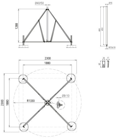 Quadripode (versione pieghevole) per tubi portanti D 50 mm con uscita laterale o asta di captazione D 40 mm con accessorio riduttore. Con cavallotto doppio di fissaggio per la connessione di 2 x Td 8-10 mm, per l?applicazione con zoccolo in cemento (peso17 kg) con adattamento all?inclinazione del tetto fino a un massimo di 10? mediante set di supporto per lo zoccolo.