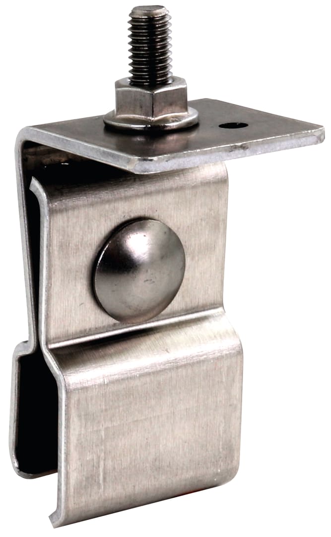 Supporto per il montaggio dell'asta di captazione per tetti metallici o del supporto per tetti metallici per il serraggio di tubi portanti HVI / HVI light; esecuzione per tetti metallici con scanalatura verticale arrotondata.