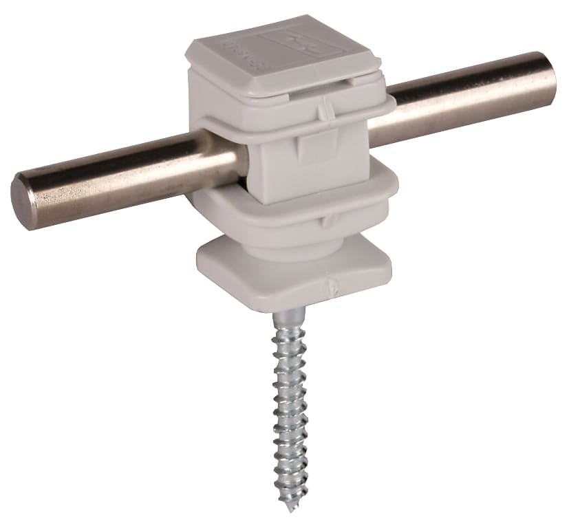 Staffa portafilo DEHNsnap per la posa di conduttori tondi. Sistema di staffaggio in materiale plastico con posa laterale e cappuccio a scatto che si innesta da solo (doppio innesto del cappuccio). Sistema di staffaggio senza viti con posa libera del conduttore. Esecuzione altezza 16 mm e filetto interno con vite, in plastica resitente alle intemperie, stabilizzata ai raggi UV e senza alogeni.