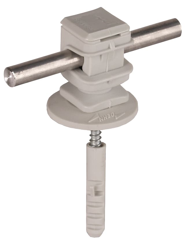 Staffa portafilo DEHNsnap per la posa di conduttori tondi. Sistema di staffaggio in materiale plastico con posa laterale e cappuccio a scatto che si innesta da solo (doppio innesto del cappuccio). Sistema di staffaggio senza viti con posa libera del conduttore. Esecuzione altezza 16 mm e premontata con viti, copertura e tassello, in plastica resitente alle intemperie, stabilizzata ai raggi UV e senza alogeni.