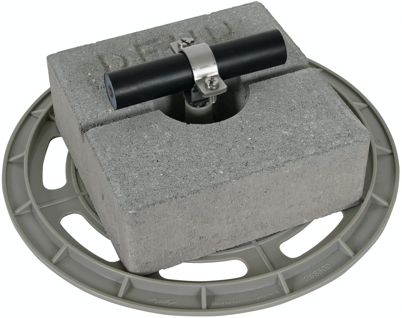 Staffa portafilo per tetti con morsetto a cavallotto a due viti in acciaio INOX per la posa della conduttura HVI power su tetti piani. Esecuzione con zoccolo in cemento e base di supporto, per conduttura 27 / 30 mm (posa fissa della conduttura).
