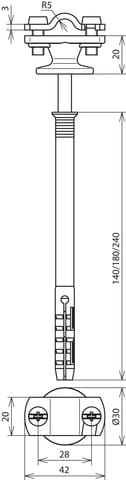 Staffa portafilo per il fissaggio di calate alle pareti con sistema di isolamento termico. Esecuzione con cavallotto a due viti e posa fissa del conduttore.
