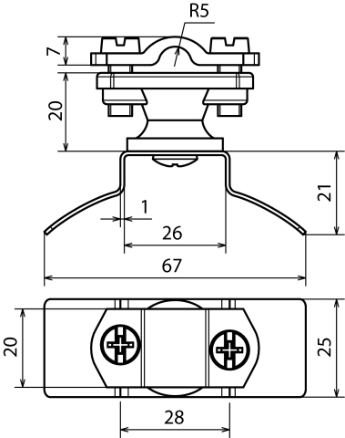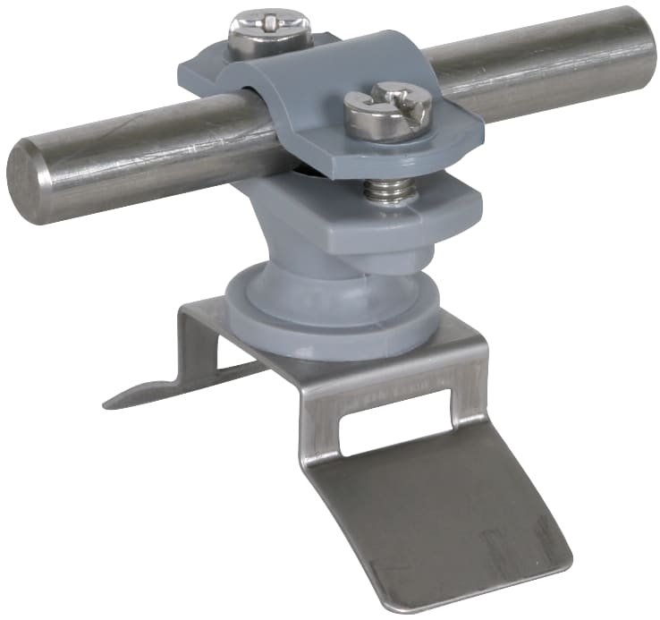 Staffa portafilo in materiale plastico per il fissaggio isolato di adduzioni a terra su pluviali metallici. In questo modo è possibile una misurazione senza smontaggio. Esecuzione per conduttori tondi, posa fissa del conduttore, in materiale plastico resistente alle intemperie, stabilizzato ai raggi UV e privo di alogeni.
