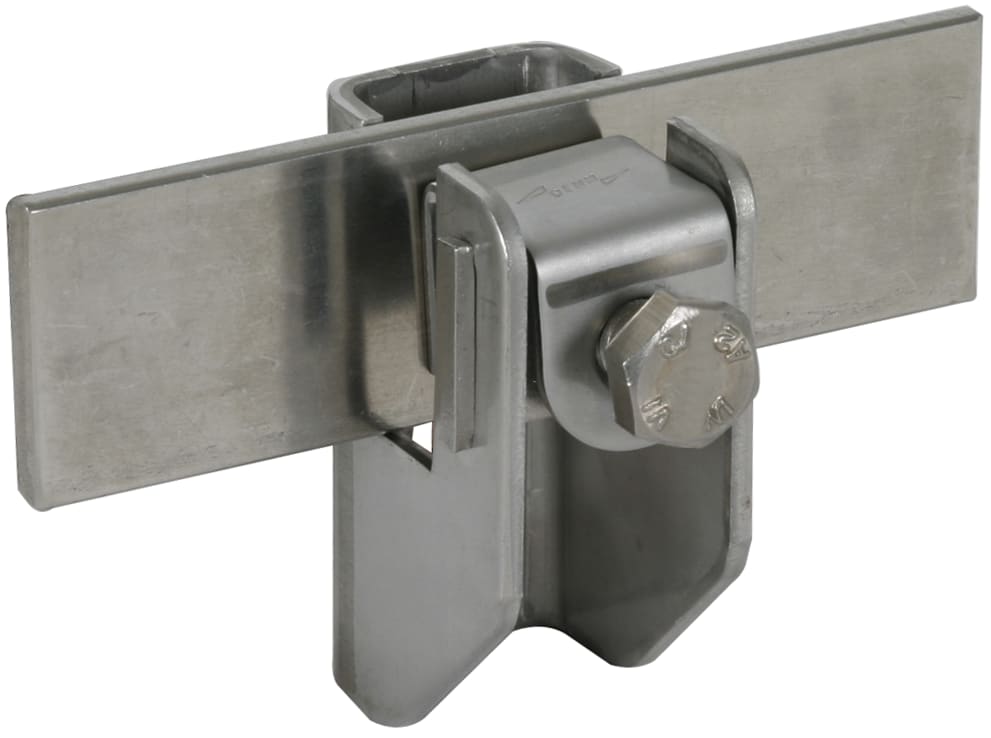 Staffa per conduttore piatto con piastra di pressione (vite M8), per la posa di conduttore piatto fino a 11 mm e conduttore tondo 6-10 mm, posa fissa del conduttore. Esecuzione con distanza parete di 11 mm.