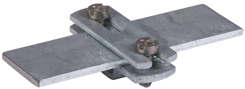 Staffa per conduttori piatti con cavalloto provvisto di fessura (forma costruttiva piatta), per il fissaggio di conduttori piatti. Esecuzione con asola (6,5 x 16 mm).