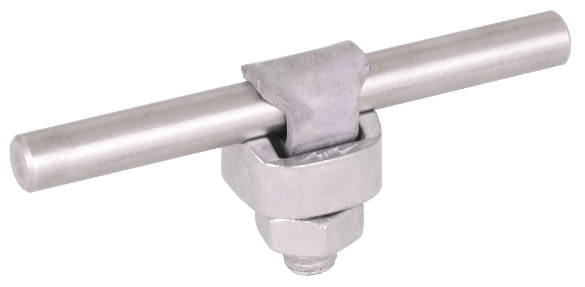 Connettore KS secondo CEI EN 62561-1 per la connessione resistente alla corrente di fulmine di conduttori tondi p.es. su profili piatti, pluviali o altri componenti dell'impianto parafulmine. Esecuzione a corpo unico Fe/tZn con vite, grova e dado M10.