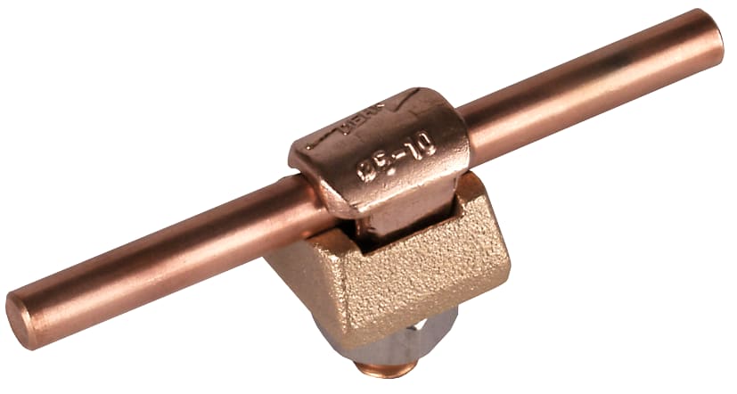 Connettore KS secondo CEI EN 62561-1 per la connessione resistente alla corrente di fulmine di conduttori tondi p.es. su profili piatti, pluviali o altri componenti dell'impianto parafulmine. Esecuzione a corpo unico Cu con vite, grova e dado M10.