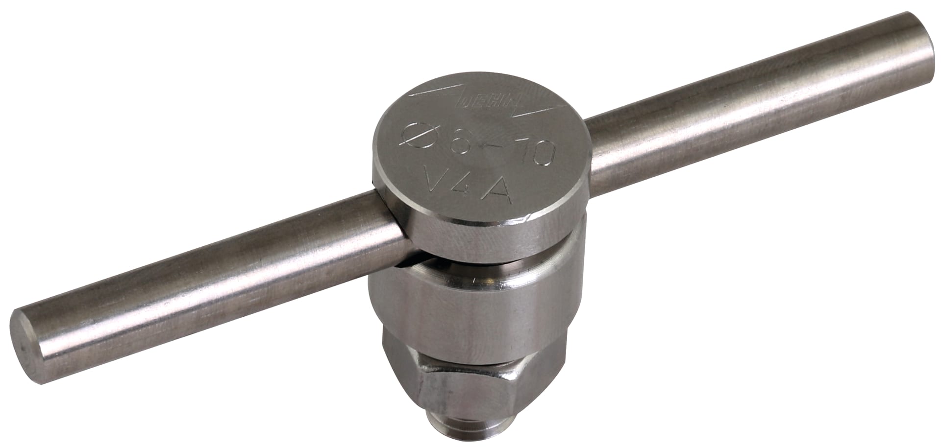 Connettore KS secondo CEI EN 62561-1, per la connessione a portata di corrente di fulmine di conduttori tondi p.es. a profilati piatti, fascette per pluviali oppure altre parti dell’impianto LPS. Esecuzione a corpo unico in acciaio INOX (V4A) con vite e dado M10.
