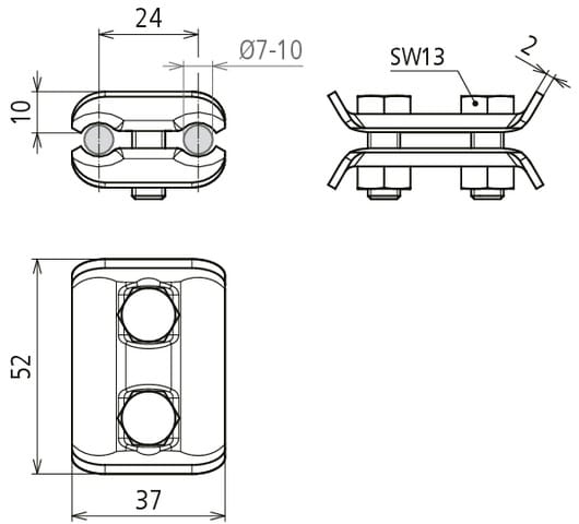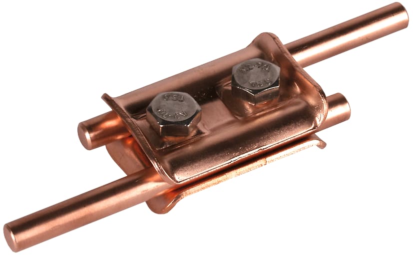 Connettore parallelo secondo CEI EN 62561-1, per il collegamento di due conduttori in modo parallelo. Esecuzione per diametri uguali, con due viti.