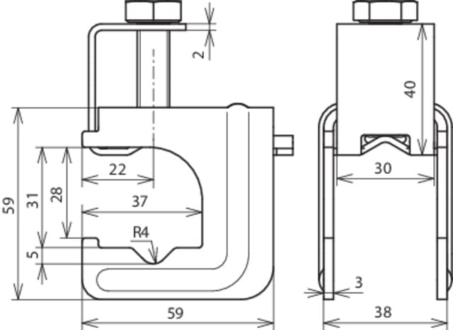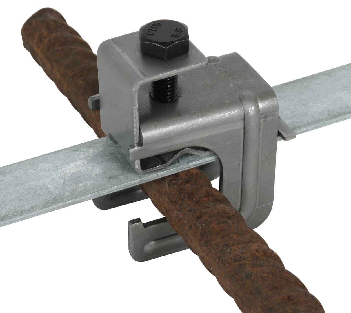 Morsetto a cavallotto a compressione secondo CEI EN 62561-1 per il collegamento di conduttori tondi e piatti in fondamenta in cemento o reti elettrosaldate e ferri d'armatura con conduttori tondi e piatti. Esecuzione per collegamenti a "T", a croce e paralleli.