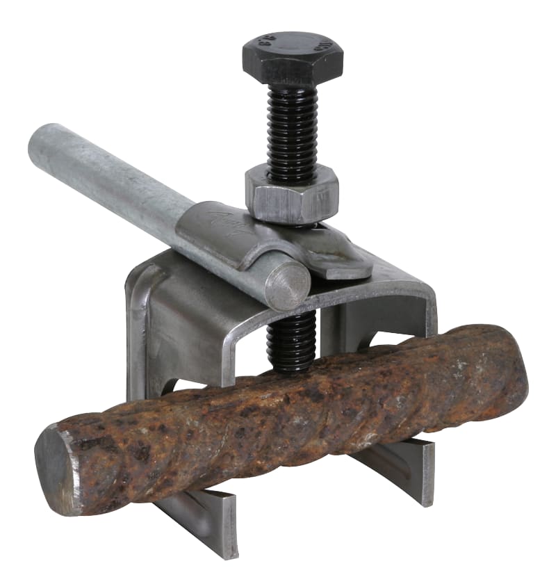 Morsetto di collegamento secondo CEI EN 62561-1 per il collegamento di armature; con cavallotto di fissaggio per la connessione flessibile di conduttori tondi o per punti fissi di terra con fissaggio contemporaneo nella cassaforma. Esecuzione per diametri piccoli.