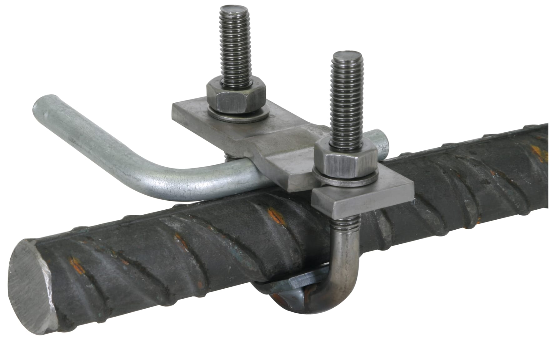Morsetto a cavallotto secondo CEI EN 62561-1 per il collegamento di ferri d'armatura con conduttori tondi o piatti. Esecuzione per grandi diametri D16-48 mm.