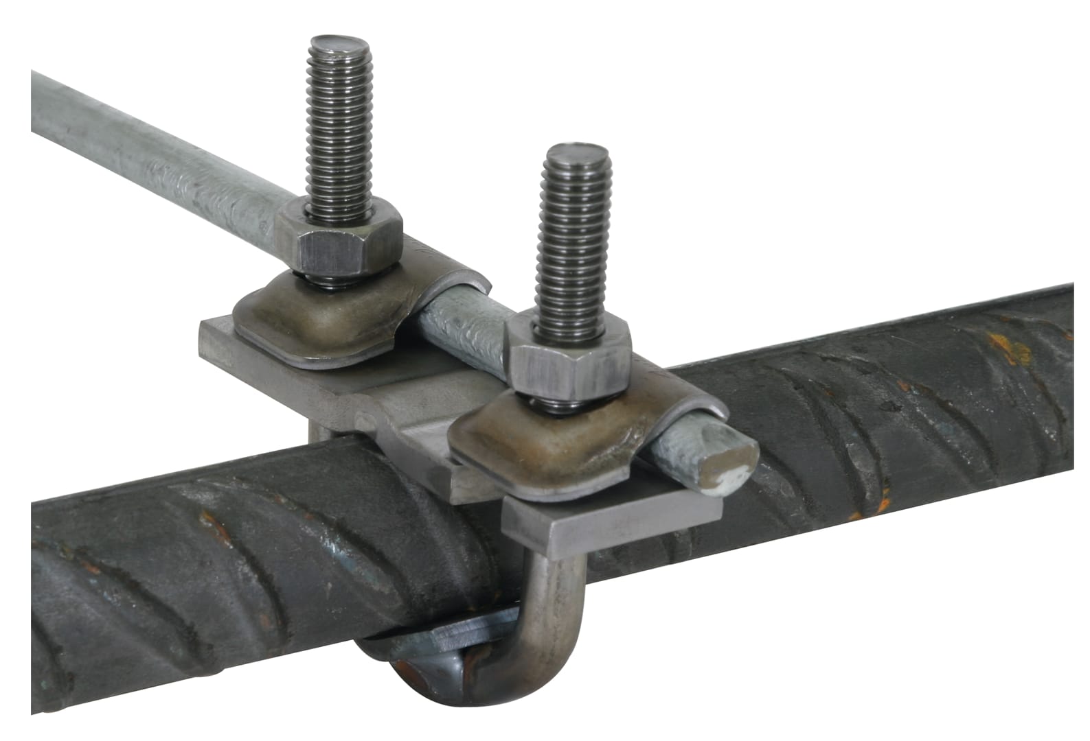 Morsetto a cavallotto secondo CEI EN 62561-1 per il collegamento di ferri d'armatura con cavallotto di fissaggio per connessione a croce di conduttori tondi o per punti fissi di terra con fissaggio contemporaneo nella cassaforma. Esecuzione per grandi diametri.