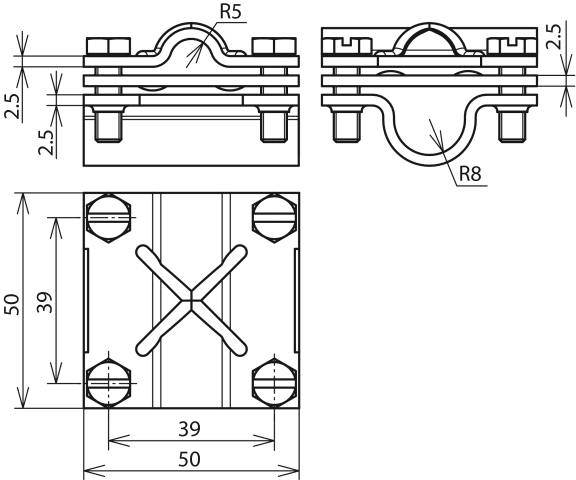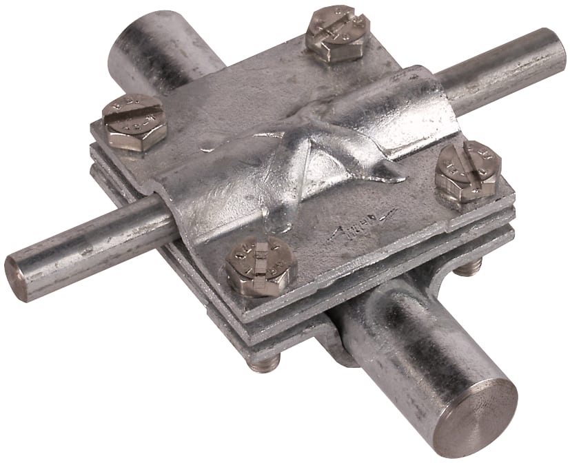 Morsetto a croce secondo CEI EN 62561-1 per collegamenti fuori terra di conduttori tondi e piatti disposti a croce e a "T". Esecuzione con piastra intermedia e viti M6.
