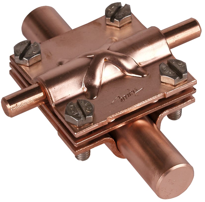 Morsetto a croce secondo CEI EN 62561-1 per collegamenti fuori terra di conduttori tondi e piatti disposti a croce e a "T". Esecuzione con piastra intermedia e viti M6.