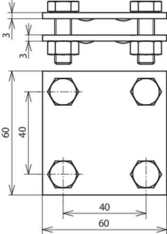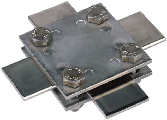 Morsetto a croce secondo CEI EN 62561-1 per collegamenti fuori e sotto terra di due conduttori piatti. Esecuzione senza piastra intermedia con viti M8.