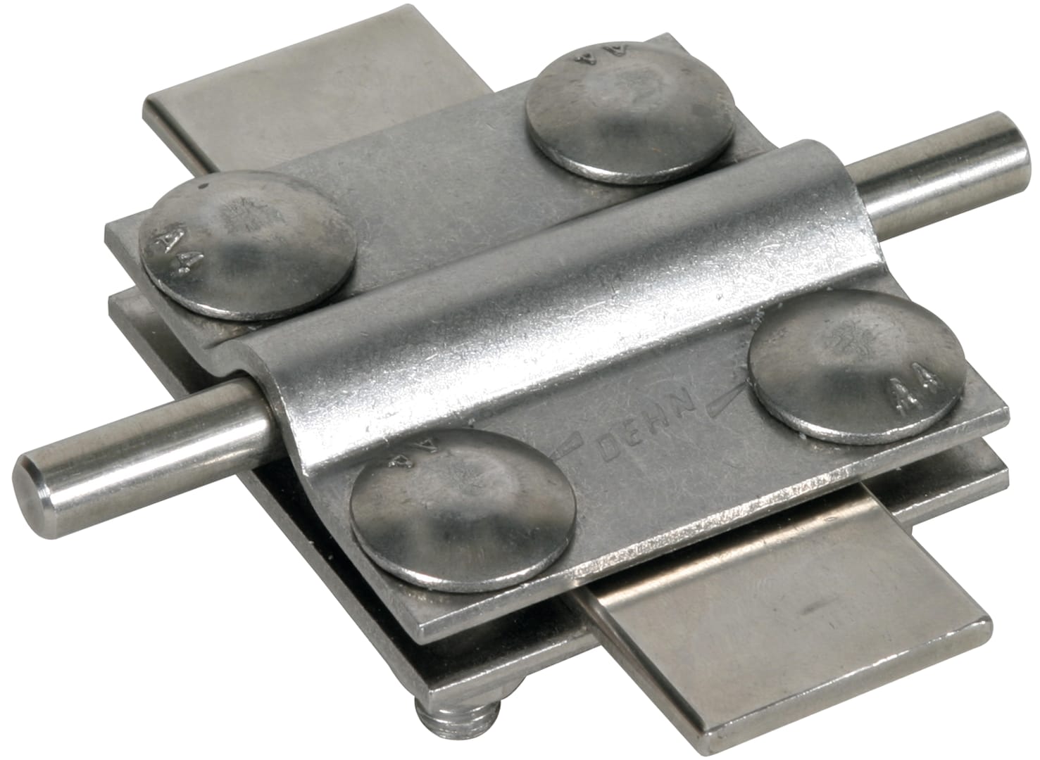 Morsetto a croce secondo CEI EN 62561-1 per collegamento fuori e sotto terra di conduttori tondi e piatti. Esecuzione con piastra intermedia e viti M8.
