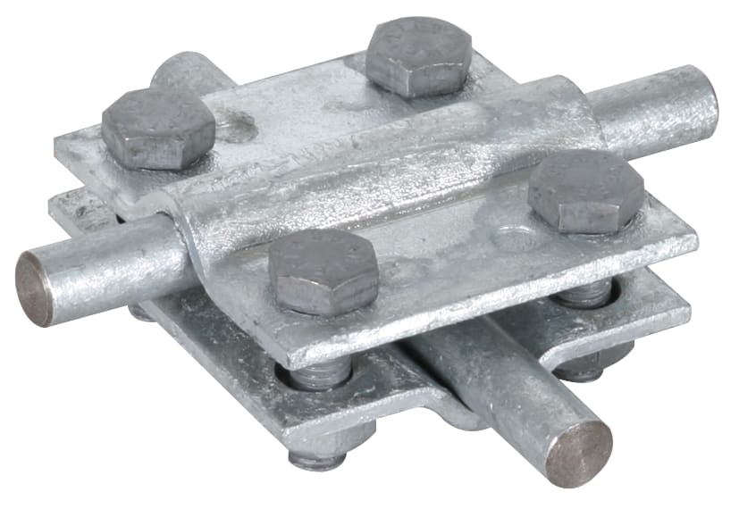 Morsetto a croce secondo CEI EN 62561-1 per collegamenti fuori e sotto terra di conduttori tondi e piatti. Esecuzione senza piastra intermedia con viti M8.
