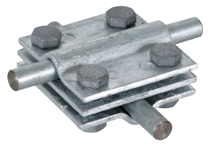 Morsetto a croce secondo CEI EN 62561-1 per collegamenti fuori e sotto terra di conduttori tondi e piatti. Esecuzione con piastra intermedia e viti M8.
