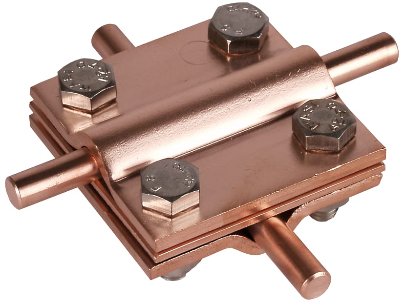 Morsetto a croce secondo CEI EN 62561-1 per collegamenti fuori e sotto terra di conduttori tondi e piatti. Esecuzione con piastra intermedia e viti M8.