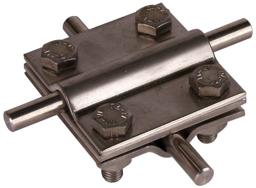 Morsetto a croce secondo CEI EN 62561-1 per collegamenti fuori e sotto terra di conduttori tondi e piatti. Esecuzione con piastra intermedia e viti M8.